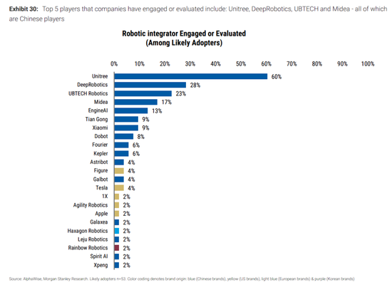 在品牌选择方面,宇树科技是参与度最高的集成商,60%的可能采用者与其有接触,其次是云深处(28%)、优必选(23%)和美的(17%)。所有主要被评估的品牌均为中国企业。