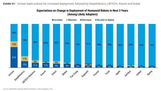 宇树科技在未来三年增加部署的前景展望中也处于领先地位(47%),其次是云深处(15%)和优必选(11%)。