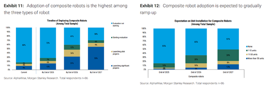 复合机器人的采用速度最快:21%的企业计划在2025年部署,2026年扩大至48%,2027年达到64%。