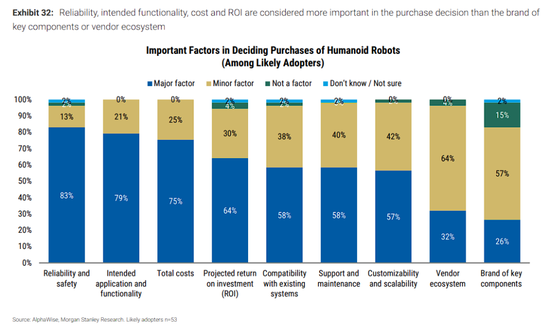 在采购决策因素中,可靠性和安全性(83%)、预期应用和功能性(79%)、总成本(75%)和投资回报率(64%)是企业最重视的因素。关键组件品牌和集成商生态系统在采购决策中的重要性相对较低。