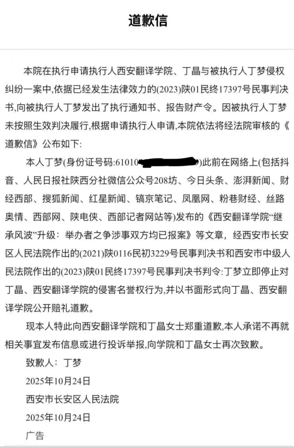 《道歉信》称,“本人丁梦此前在网络上(包括……澎湃新闻等)发布的《西安翻译学院‘继承风波’升级:举办者之争涉事双方均已报案》等文章,经西安市长安区人民法院作出的(2021)陕0116民初3229号民事判决书和西安市中级人民法院作出的(2023)陕01民终17397号民事判决书判令:丁梦立即停止对丁晶、西安翻译学院的侵害名誉权行为,并以书面形式向丁晶、西安翻译学院公开赔礼道歉。”