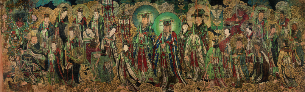 平阳府《朝元图》原置于山西平阳府某道观东、西两壁,是中国流失海外的道教艺术珍品。其中东壁长10.2米、高3.2米,绘28位神像;西壁长10.4米、高3.2米,绘31位神像。两壁共59位神祇与侍从,神情肃穆庄重,均面朝北方,呈朝拜参谒行列。场面宏大磅礴,色彩绚烂厚重,人物造型精湛生动,堪称中国艺术史上的上乘之作。壁画主像显示特殊的“四帝二后”结构:东壁以头戴12旒冕旒、着青色衮龙服的玉皇大帝为核心,侧配紫微北极大帝与佩坤卦标识的后土皇地祇;西壁居中为身着绛色衮服的神霄长生大帝,左右分列东华帝君与西王母,次要神祇涵盖北斗七星、五星、五方五帝、北极四圣、南斗六星、三台星君、十二地支,遵循宋代道经《上清灵宝大法》的神祇位序。