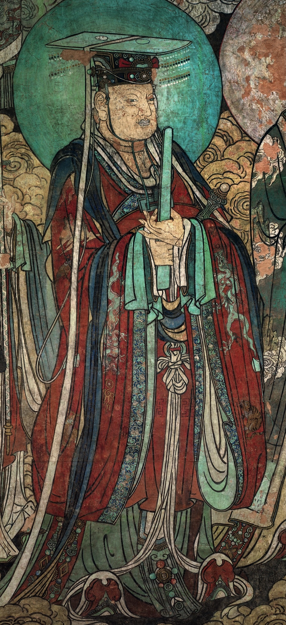 李凇教授认为,平阳府《朝元图》是全真教融合神霄派等其他流派而绘制的,主像显示了较为特殊的“四帝二后”结构。其西壁着红色衮服的主像(E)为神霄长生大帝。风格面貌确有宋代意蕴, 是宋代徽宗时期图式的再生。西壁特殊的无冕旒的主像(D)不是老子,而是当时流行的东华帝君,全真教特别强调的五祖之一,被元代皇帝两次加封,他与东王公合为一体,可看作是永乐宫三清殿东壁东王公像的前身。