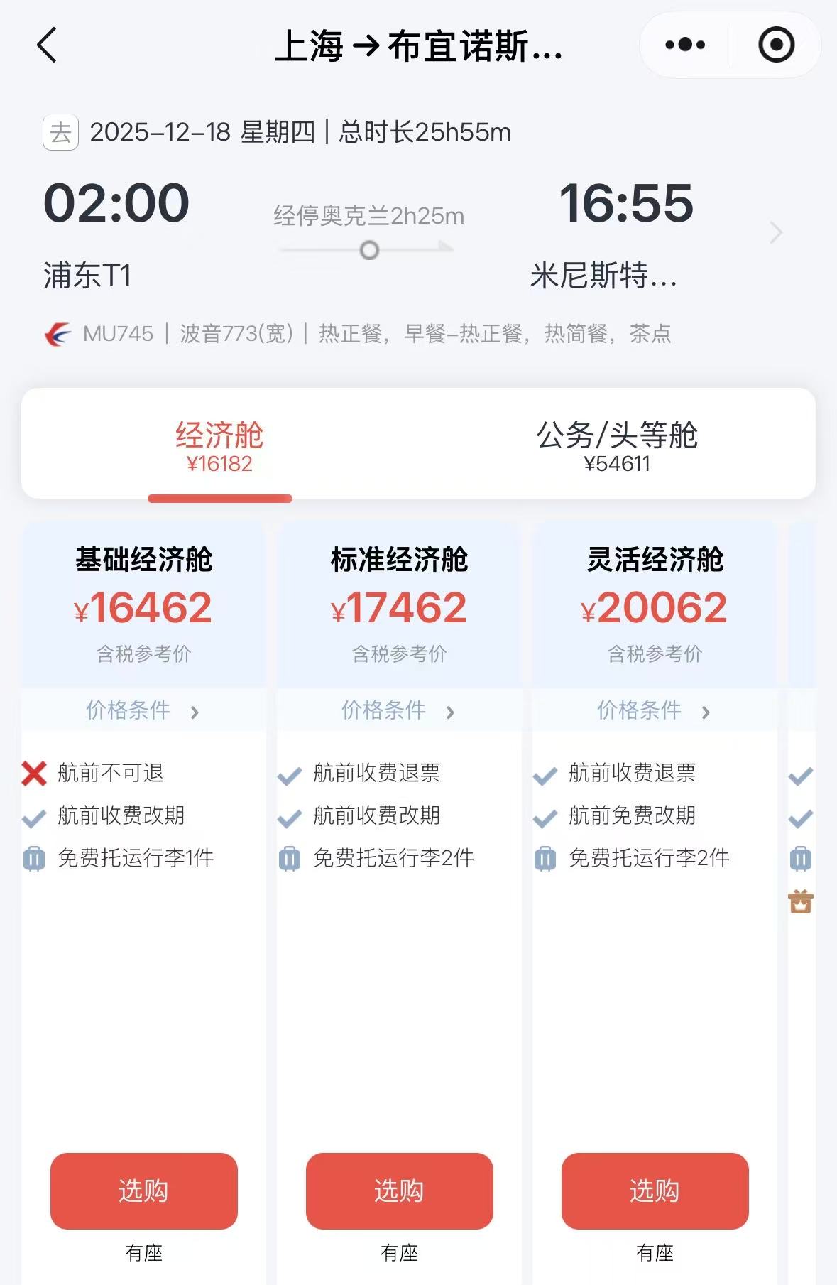 界面新闻记者在东航小程序查询购票信息显示,该航班临近日期12月15日去程、12月19日返程的往返经济舱票价为30562元起,余票仅剩余1张;如选择12月18日出行、12月26日返程,则机票更为充裕,票价16462元起。此外,携程等OTA平台该航线机票也在售。
