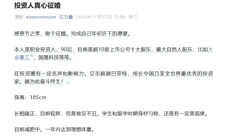 11月27日,名为“亿万鑫”的公众号发布了一篇《投资人真心征婚》的内容。作者自称是职业投资人,90后,目前是超10家上市公司十大股东,最大自然人股东,比如大金重工,国晟科技等等。