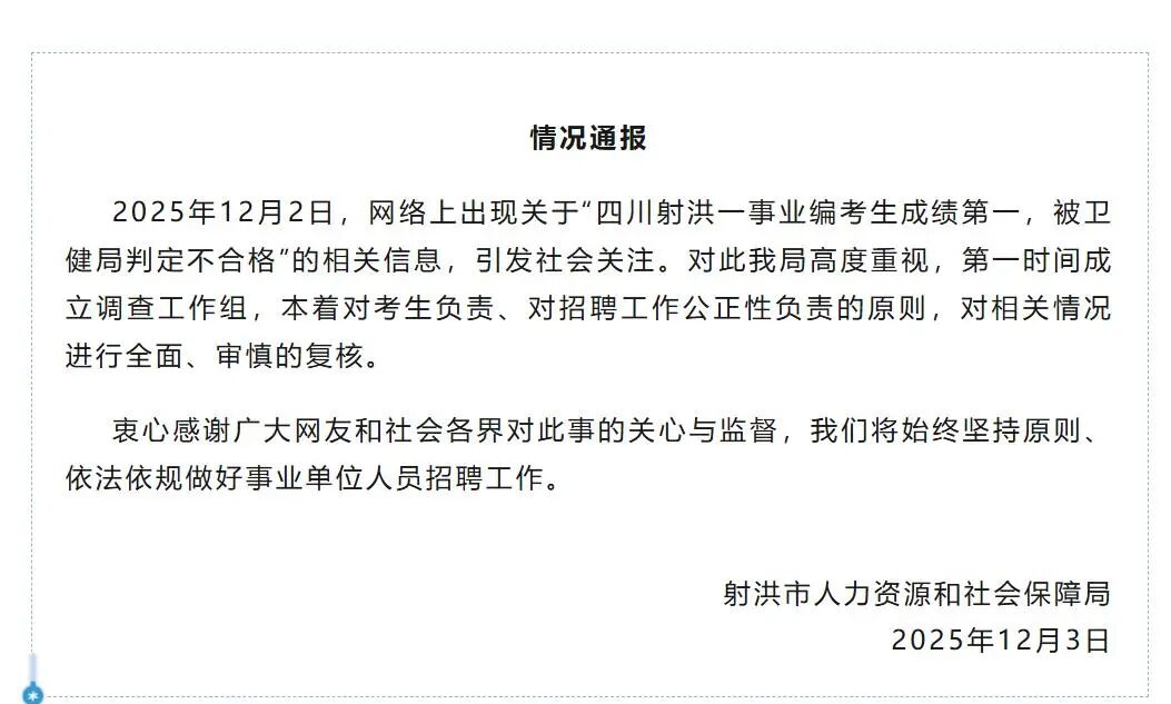 12月3日,射洪市人社局发布通报表示,“对此我局高度重视,第一时间成立调查工作组,本着对考生负责、对招聘工作公正性负责的原则,对相关情况进行全面、审慎的复核。”