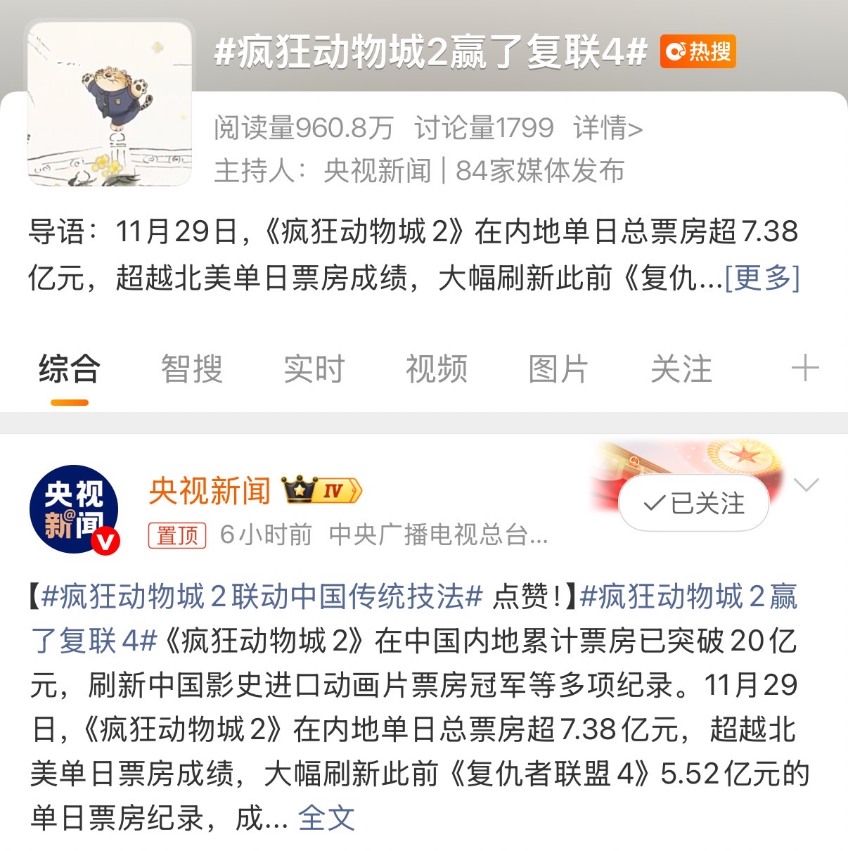 据央视新闻,11月29日,《疯狂动物城2》在内地单日总票房超7.38亿元,超越北美单日票房成绩,大幅刷新此前《复仇者联盟4》5.52亿元的单日票房纪录,成为内地影史进口片的单日票房冠军。相关报道话题#疯狂动物城2赢了复联4#登上社交媒体热搜。