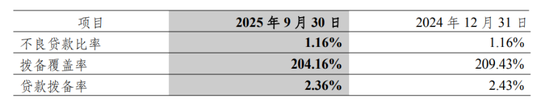 截至2025年9月末,该行不良贷款余额669.39亿元,较上年末增加4.54亿元,不良贷款率1.16%,与上年末持平,拨备覆盖率204.16%,较上年末下降5.27个百分点,贷款拨备率2.36%,较上年末下降0.07个百分点。