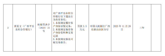 同时,黄某文(广西平乐农村合作银行)对广西平乐农村合作银行以下违法行为负有责任:1.未按规定履行客户身份识别义务;2.未按规定保存客户身份资料和交易记录3.未按规定报送可疑交易报告,被罚款3.5万元。