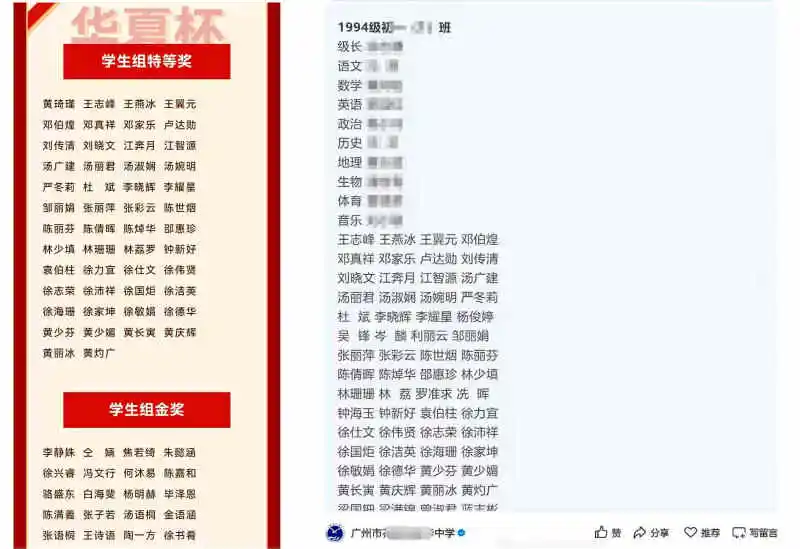 此外,还有网友发现,上述书法大赛学生组获奖名单与网上某中学1994级初一班级名单完全一致。