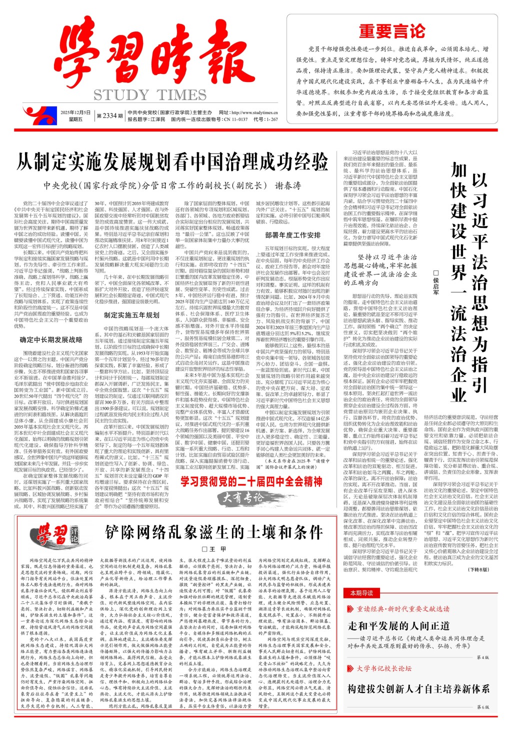 合力方能致治,网络生态治理是一项系统工程,必须统筹运用法治、群治、智治多种手段,形成综合治理的强大合力。发挥好法治的刚性约束作用,统筹推进网络领域立法执法司法普法,加快完善网络法律法规体系,压实平台主体责任,以法治力量为网络空间划定底线红线。发挥群众参与网络治理的广泛力量,畅通举报投诉渠道,强化行业协会自律作用,壮大网络文明志愿者队伍,调动广大网民参与监督的积极性,形成共建共治共享的治理氛围。善于运用人工智能、大数据等先进技术赋能网络治理,建立健全风险预警、应急处置、溯源追责等长效机制,确保对网络乱象发现在早、处置在小,不断提升治理效能。唯有法治固本、群治强基、智治赋能,才能构筑起防范网络乱象的严密防线。