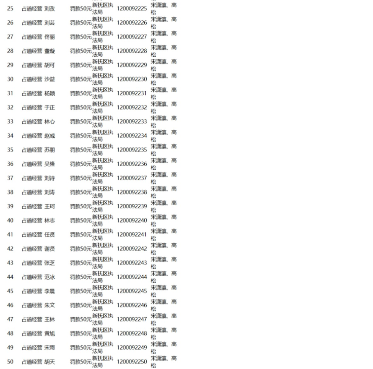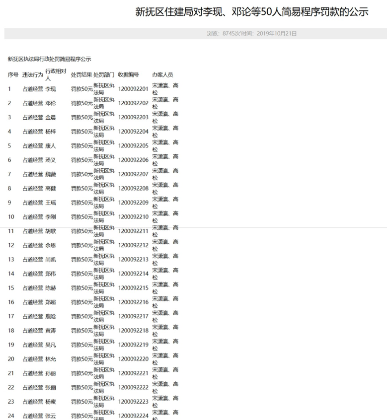 12月4日,有网友发现辽宁抚顺新抚区住建局于2019年10月21日公示的一占道经营处罚名单疑存猫腻,其上的名字不但均为“姓氏+单名”的两字结构,而且还不少与知名艺人重名,如李现、邓伦、金晨、董璇、杨颖等。