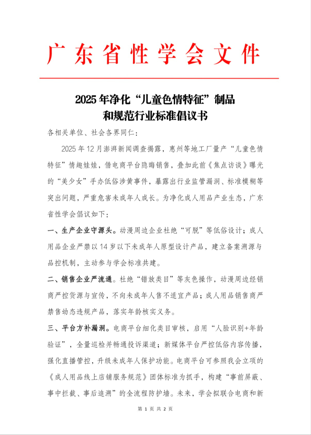 广东省性学会作为长期深耕行业规范建设、为政府建言献策的专业学术团体,近年来牵头制定多项行业标准,深度参与相关领域监管支撑工作。事件发生后,我们既收到大量企业关于“阳光化规范化、良币驱逐劣币”的迫切诉求,也响应市场监管、卫健委等部门要求,完成了行业乱象专项调研并形成报告。乱象重现绝非单一环节问题,而是“商家钻空子、平台没堵上、标准不清晰、保护不到位”共同作用的结果。为彻底净化行业生态、筑牢未成年人保护防线,广东省性学会现发出如下倡议: