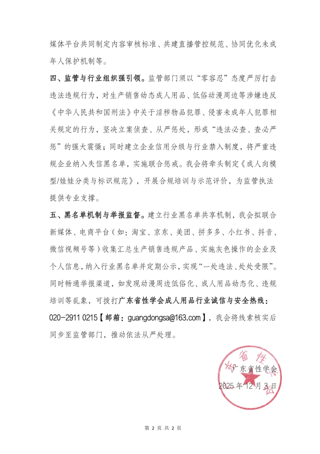 广东省性学会将以已立项的《成人用品线上店铺服务规范》等标准为基础,全面扛起责任:牵头《成人向模型/娃娃分类与标识规范》等团体标准研制工作,明确“二次元幼态”与“仿真幼态”的界定边界;开展合规培训;依据标准开展“合规示范单位”评价并公示;开展性心理健康服务,对特殊癖好人群进行心理疏导,发布年度行业白皮书,为监管部门提供决策支撑,搭建政企沟通桥梁。未成年人保护是全社会的共同责任,需要学校、家庭、社会组织协同发力构建防护网络。各学校要将未成年人价值观教育、审美教育与法治教育纳入日常教学,通过主题班会、案例分析、专家讲座等形式,引导学生树立正确的审美观念、消费观念和法治意识,提高对低俗产品的辨别与抵制能力。相关社会组织要积极参与未成年人保护公益宣传,通过线上科普、线下活动等形式,向社会普及违规产品的危害,营造“共同抵制低俗产品、守护未成年人成长”的社会氛围。良币驱逐劣币需要每一位从业者的责任坚守,未成年人健康成长需要全社会的协同守护。当前行业乱象的根治,既需要生产企业筑牢源头防线、销售企业摒弃灰色操作,更需要平台方补位监管漏洞、监管部门强化执法力度、行业组织健全标准体系、社会各界凝聚保护合力。让我们携手并肩,以法律法规为刚性底线,以行业标准为明确指引,以社会责任为核心使命,坚决铲除违规产品滋生的土壤,推动动漫周边及衍生产品行业阳光化、规范化发展,为未成年人营造健康、安全、纯净的成长环境!