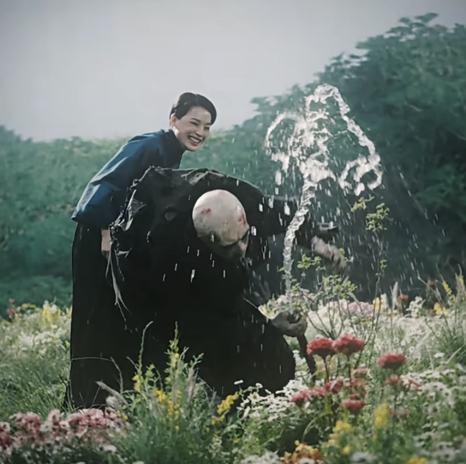 毕赣:像舒淇那场,罂粟花之梦,转盘那场戏,表演其实没法指导,完全靠她的才华和天赋。所以她来了以后,我就先把底层逻辑告诉她,为什么要设计这场戏以及这场戏实际上是一场梦境逐渐被解构,直到空落落的一块一块地拿掉,所以首先她知道了我是有目的地在处理这件事情,不是图好看。然后我就告诉她整个表演:我希望像是舞蹈,你就进去一直在转圈跳舞。好像就说了这么两点,开拍的时候她就是如你现在看到的基本上没有什么差距了,然后即使拍了十来条甚至二十几条,其实都在调里面很小的具体的细节,哪个点她需要怎么样之类的。所以和她的沟通我其实很轻松。小姑爹和我合作十年了,但实际上这次拍摄小姑爹比其他的演员要更焦虑,为什么?因为他的阈值被拔得很高了,就是表演这场戏,他知道我不会善罢甘休,他知道一定是折磨到死,所以他的阈值非常高,他对自己整场戏表演的压力会很强。