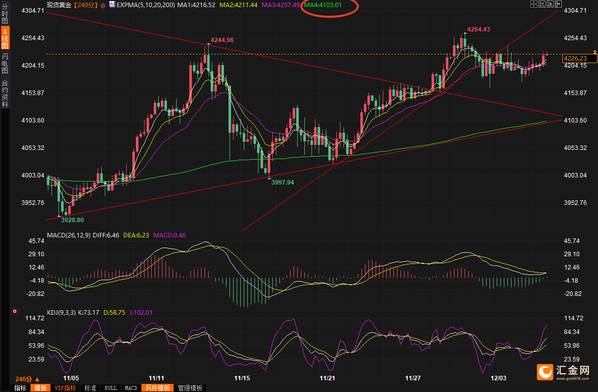 本周呈现典型的震荡整理格局,价格始终被牢牢限制在周内高低点之间,未能出现单边突破。表面看多空双方陷入胶着,实则市场正在进行一场“方向前的蓄势”。交易员普遍选择在今晚美国9月PCE通胀数据公布前保持观望,不愿轻易站队。这种谨慎情绪使得黄金短期缺乏明确趋势,但也为数据公布后的剧烈波动埋下了伏笔。周五(12月5日)亚欧时段,现货黄金小幅上涨,一度触及4230关口,涨幅约0.5%。