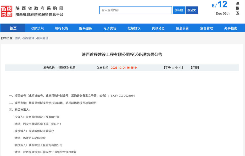 12月4日,杨陵区财政局在陕西省政府采购网发布《陕西首程建设工程有限公司投诉处理结果公告》。