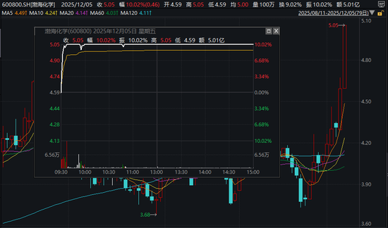 行情数据显示,近两个交易日渤海化学股价表现强势。昨日(12月4日),公司股价收涨超6%;今日(12月5日),公司股价涨停。