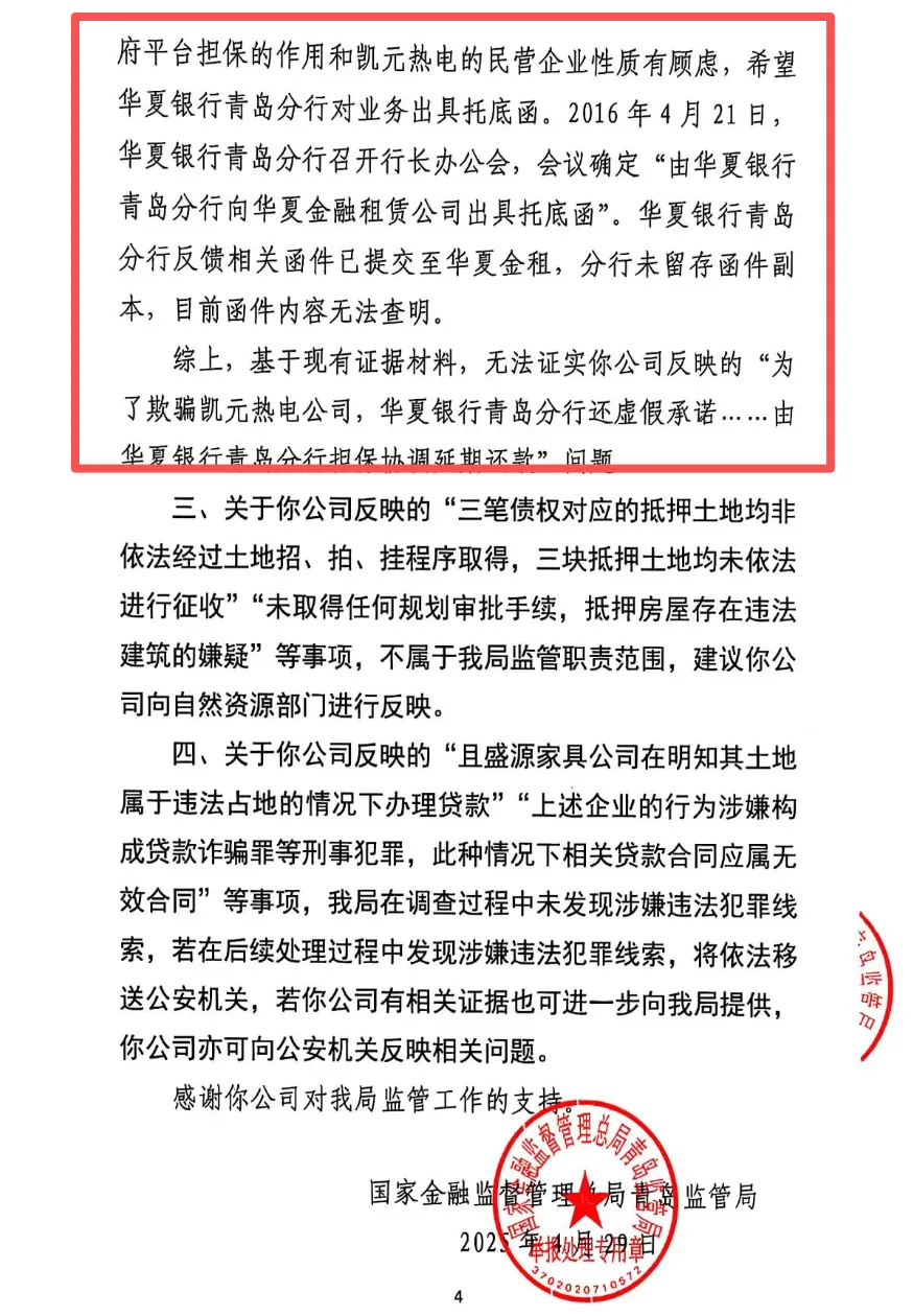 邹建辉还表示,青岛金管局在履行监管职责时,明知华夏银行青岛分行出具托底函就是担保行为,既未依上述法律法规对其违反金融监管规定行为依法给予处理,也未向华夏金租调取托底函这一关键证据,属于不履行法定职责。青岛金管局这种流于形式的调查处理方式,并未全面公正查明举报问题,其调查结果明确了华夏银行青岛分行在办理抵押过程中缺少现场勘察,针对该违规行为,应当按照规定告知凯元热电“将依法予以处理”,但青岛金管局并未告知也未处理。