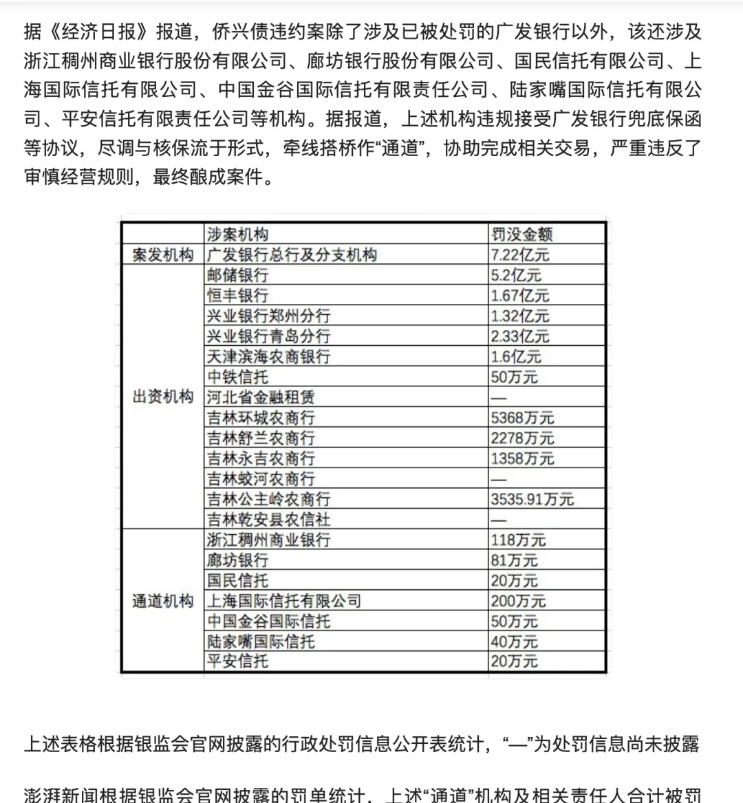 在这一事件中,10多家金融机构拿着广发银行惠州分行出具的托底函,先后向广发银行询问并主张债权。白鹿新闻援引澎湃新闻的早前报道称,据《经济日报》报道,侨兴债违约案除了涉及已被处罚的广发银行以外,该案还涉及浙江稠州商业银行股份有限公司、廊坊银行股份有限公司、国民信托有限公司、上海国际信托有限公司、中国金谷国际信托有限责任公司、陆家嘴国际信托有限公司、平安信托有限责任公司等机构。据报道,上述机构违规接受广发银行兜底保函等协议,尽调与核保流于形式,牵线搭桥作“通道”,协助完成相关交易,严重违反了审慎经营规则,最终酿成案件(如下图)。