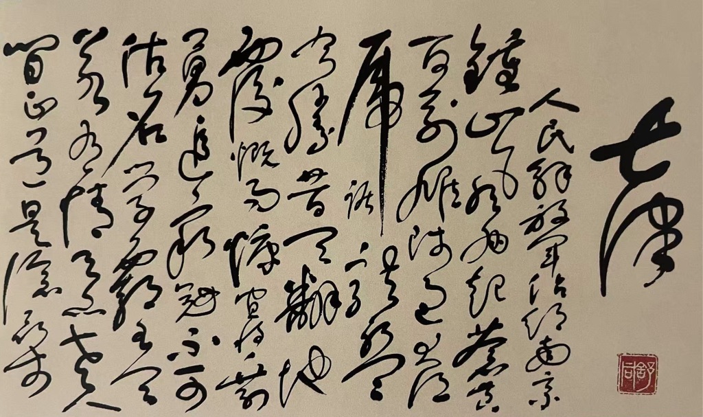 1966-1976十年期间,舒同受到了冲击。即便身陷囹圄,他对于书法的热爱与执着也未曾消减。澎湃新闻记者注意到一幅舒同系狱期间,誊写的一幅毛泽东诗词《七律人民解放军占领南京》(平反后,右下角补盖舒同印章),堪称个人艺术风格与时代精神的深刻融合。这件作品采用典型的舒体草书风格,整体气韵连贯,笔势跌宕起伏,展现出作者在困境中依然保持的创作激情与艺术掌控力。
