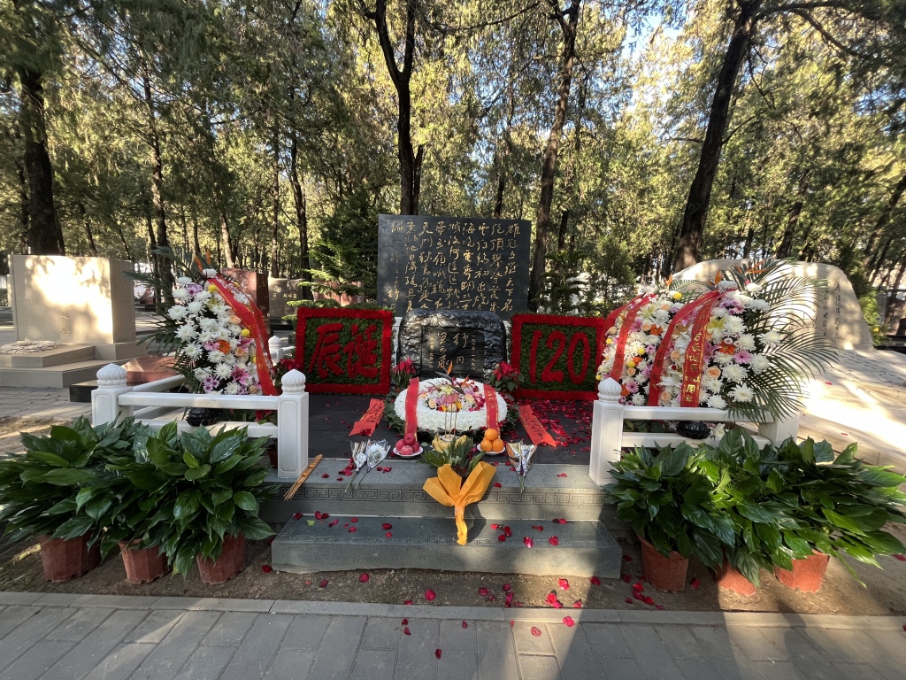 展览当日上午的座谈会结束后,澎湃新闻与筹办纪念活动的相关人员一起前往京西八宝山革命公墓,参观并瞻仰舒同、王云飞伉俪墓地。这座墓地坐落于公墓静谧的园林区内,整体设计庄重典雅,体现了对革命前辈的崇高敬意。