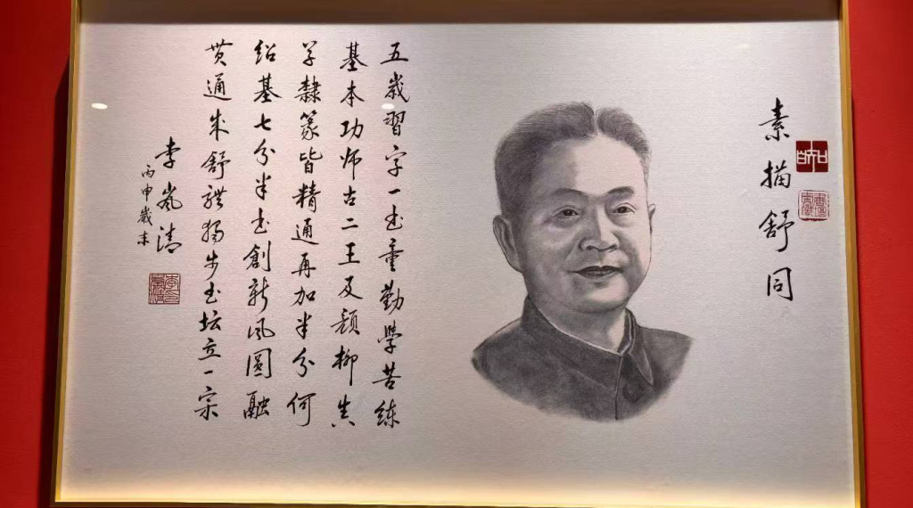 尤为值得一提的是,在展览起首位置一幅素描配诗的展品,引起了众多观众的瞩目。这幅由李岚清创作的《素描舒同》诗书配画作品,是一件融诗、书、画于一体的纪念性作品。