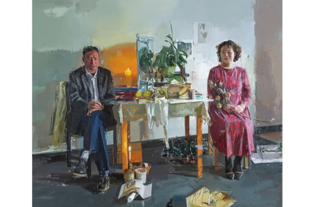 与之形成有趣对话的是青年艺术家李依祎的获奖油画《你会嫁给我吗?》,这件作品源自艺术家对婚姻主题的思考,她通过邀请真实的情侣或夫妻在特定布景中互动,捕捉并描绘两人之间微妙的能量与关系。