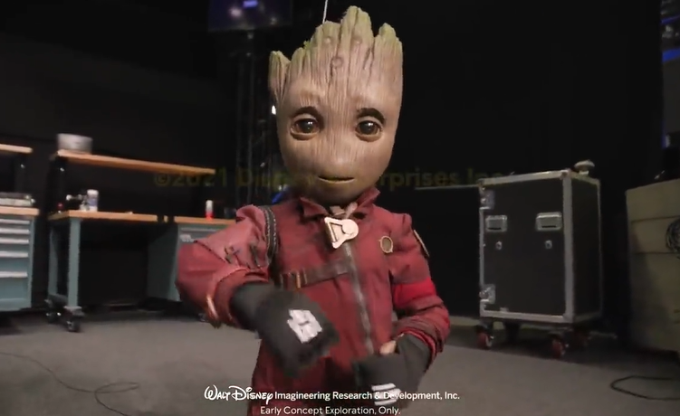 于是在 2017 年,迪士尼在西南偏南音乐节上宣布,要在乐园中推出卡通形象机器人。在历经多年研发后,2021 年他们带来了以《银河护卫队2》中小树人格鲁特为原型的机器人,身高只有 76 cm 的它可以眨眼、也可以做一些简单的动作,不过在智能化的交互上还是有些欠缺。