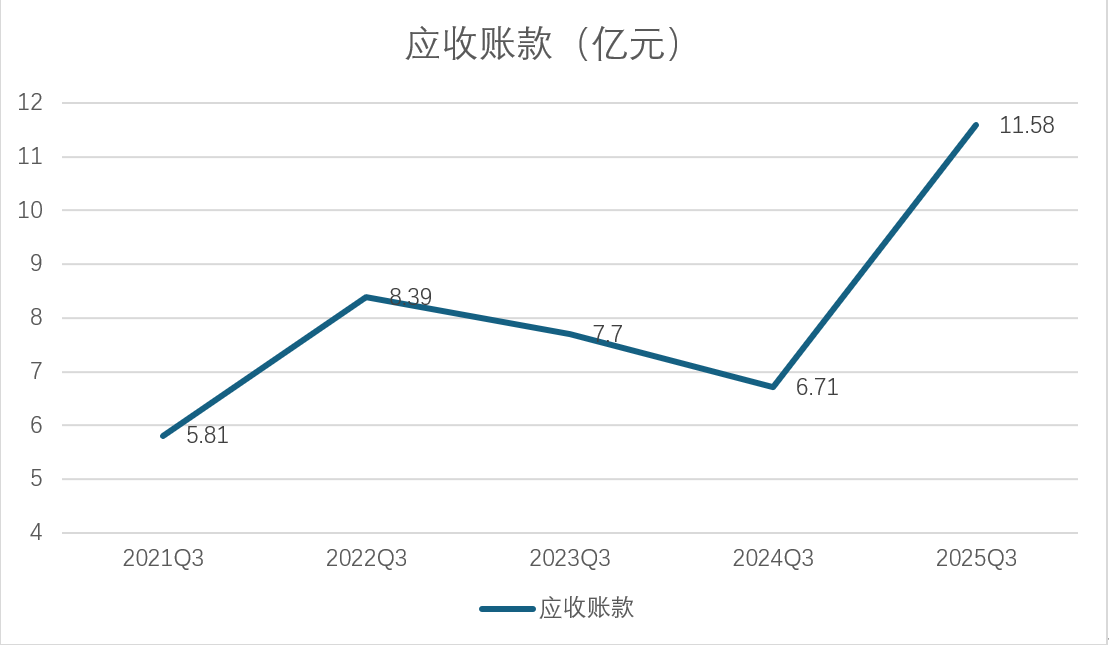 大客户战略的另一个副作用体现在财务数据上是应收账款的急剧攀升。截至 2025年9月底,和胜股份应收账款高达11.58亿元,较2024年末的7.97亿元增加3.61亿元,同比更是增长73%,远超同期营收17.09%的增幅。
