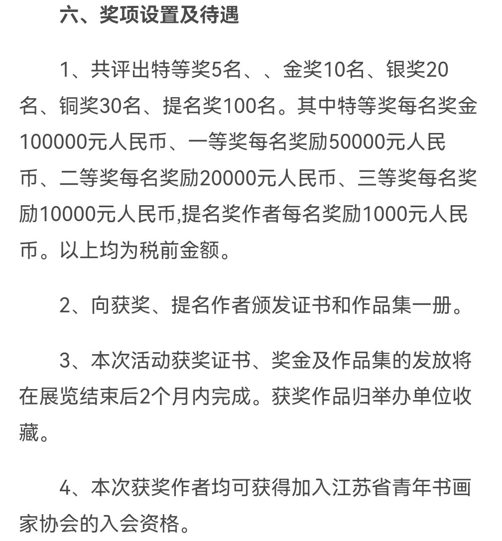 此外,在奖项设置及待遇方面,征稿启事提到,该赛事共评出特等奖5名、金奖10名、银奖20名、铜奖30名、提名奖100名。其中特等奖每名奖金100000元人民币、一等奖每名奖励50000元人民币、二等奖每名奖励20000元人民币、三等奖每名奖励10000元人民币,提名奖作者每名奖励1000元人民币。以上均为税前金额。本次获奖作者均可获得加入江苏省青年书画家协会的入会资格。
