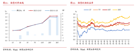 过去一周(2025年12月01日-2025年12月05日)10年国债利率呈现先上后下倒V型走势。12月1日,11月制造业PMI录得49.2%,继续处于收缩区间,下午市场期待央行买债放量,情绪缓和,250016利率小幅下行并收盘于1.8275%;12月2日,市场关注央行对于银行系统的债券投资调研情况,尾盘央行公布买债500亿元,250016利率小幅上行并收盘于1.836%;12月3日,市场对于基金分红监管收紧担忧再起,叠加12月会召开政治局会议,利率小幅上行,250016利率收盘于1.8375%;12月4日,金融时报发布的潘行长文章引发市场关注,市场情绪总体偏弱,尾盘央行公告买断式逆回购投放1万亿,全天利率大幅上行,250016收盘于1.85%;12月5日,债市超跌反弹,250016收盘于1.8285%。全周来看,利率先上后下,10年国债活跃券(250016)日内最高点接近1.8610%。