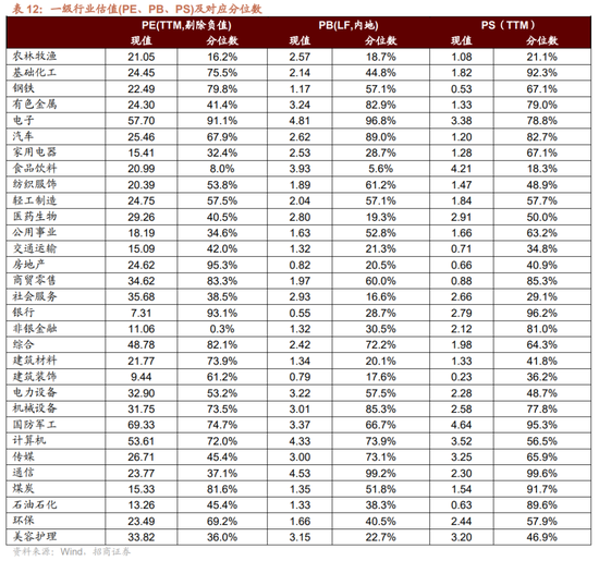 在行业估值方面,本周指数估值多数上涨,其中,有色、军工和机械估值涨幅居前,计算机、传媒和美容护理跌幅居前。有色指数估值上涨1.48至24.30,处于41.4%历史分位(近十年,下同);军工指数估值上涨0.77至69.33,处于74.7%历史分位;机械指数估值上涨0.86至31.75,处于73.5%历史分位;计算机指数估值下跌0.61至53.61,处于72.0%历史分位;传媒指数估值下跌0.90至26.71,处于45.4%历史分位;美容护理指数估值下跌0.82至33.82,处于36.0%历史分位。截至12月5日收盘,一级行业估值排名前五的行业分别是国防军工、电子、计算机、社会服务、商贸零售。