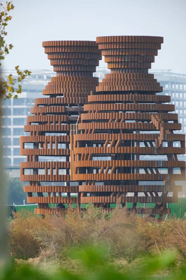 园内设置3大类型共9处景观雕塑,以具象化艺术语言强化空间叙事张力,让游客在观赏中深度沉浸于远古文明的文化肌理。园区南门的“大河双连壶”,以破土而出的造型再现考古现场风貌,直观传递文物出土的历史厚重感;同处南门区域的“大河山水共生”传递着千古以来山水格局蕴含的文化脉络与历史讯息,也诉说着雄壮山河滋养下延绵不绝的华夏文明。广场7米高的“大河・彩韵承舟”以遗址代表性文物白衣彩陶盆为原型,传递文明延续的生命力;核心区的“大河・天象赋”则呼应遗址天文元素,生动展现先民对宇宙的早期认知。