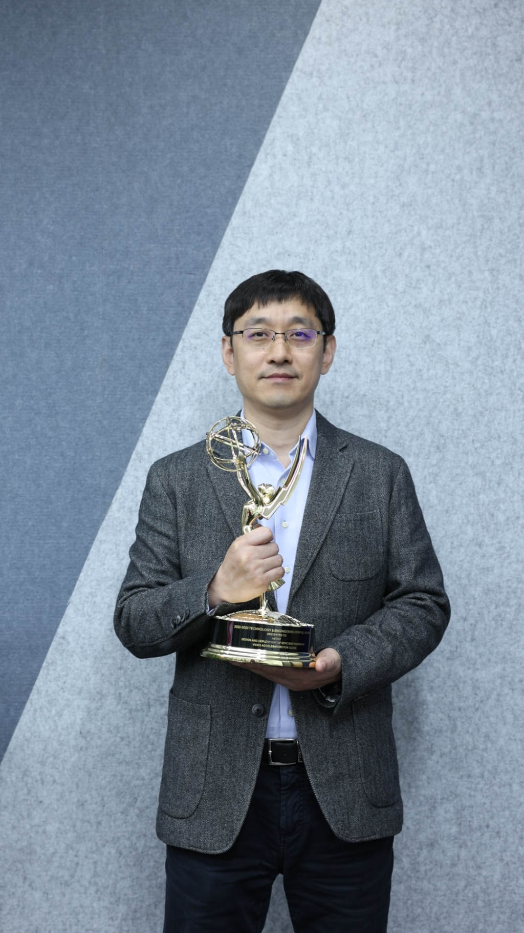 镕铭微电子CEO朱照远手持第75届艾美奖(技术与工程奖获奖)奖杯。澎湃新闻记者 陈鑫露 摄