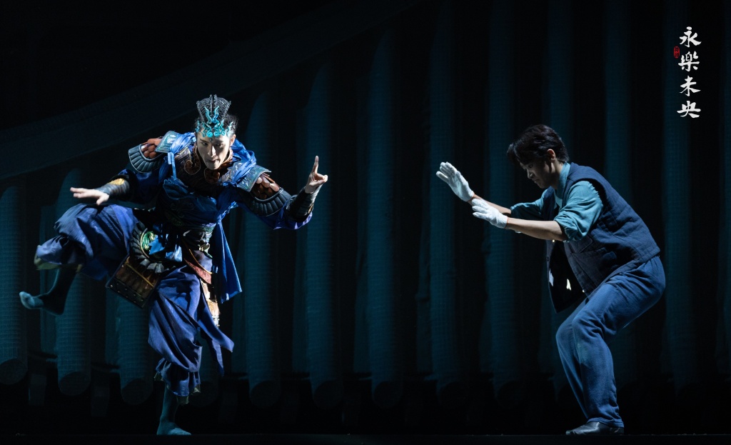 舞台上古今交错、双线叙事:元代督建者与当代建筑师心神交汇;元代女画工与当代美术师隔空共鸣;七百余岁的蓝釉角神与琉璃匠师相互陪伴;迁建者挥洒十年青春,和三门峡争先,和黄河水赛跑,最终让永乐宫重获新生。