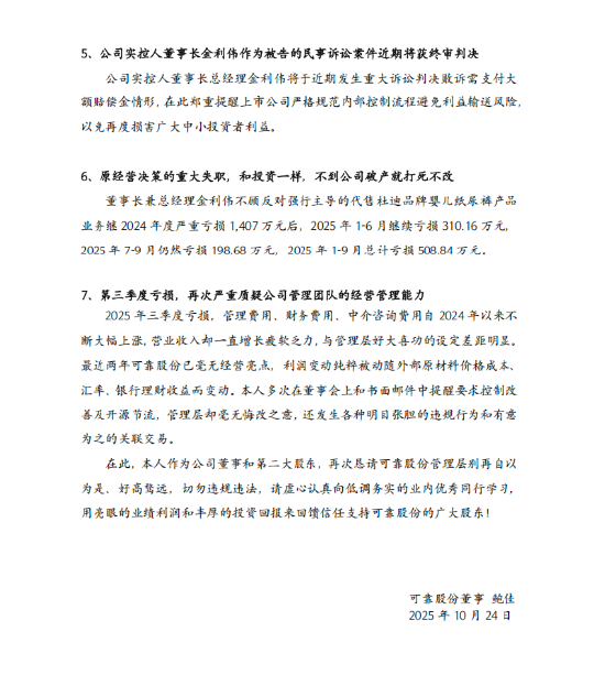 对于上述说法,可靠股份投资者关系部门向《BUG》栏目回应称,“公司情况、三季报、董事意见等相关问题,公司严格遵循相关规定履行决策程序及信息披露义务,有关内容请详见具体公告。此外,公司高管团队的聘任均严格依据《公司法》《公司章程》及公司内部治理制度,经过董事会提名委员会审核,并最终由董事会审议通过,程序合法、合规。公司治理结构运行有效,董事会决策机制健全。”