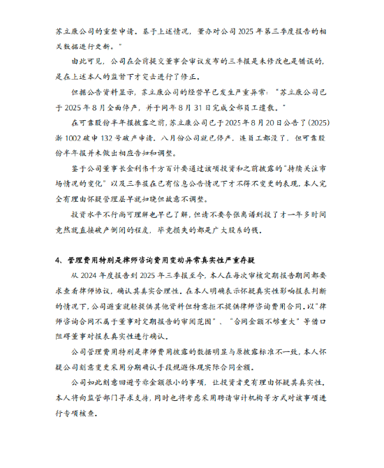 - 关联交易在三季度被证实违规,已被监管警示和约谈;2、仍存在未暴露的公司实控人董事长金利伟涉嫌代持供应商浙江富临科技股份行为,或涉嫌重大利益输送,审计委员会正在核查;3、定期报告披露违规,本人多次反对的公司投资项目半年报披露前就已破产,2025年半年度报表数据隐瞒未披露调整,涉嫌半年报信息披露违规;4、管理费用特别是律师咨询费用变动异常真实性严重存疑;5、公司实控人董事长金利伟作为被告的民事诉讼案件近期将获终审判决,需防止其通过关联交易等方式转移公司资产以偿付个人债务;6、原经营决策的重大失职,和投资一样,事实证明有问题也不整改;7、第三季度亏损,再次严重质疑公司管理团队的经营管理能力。