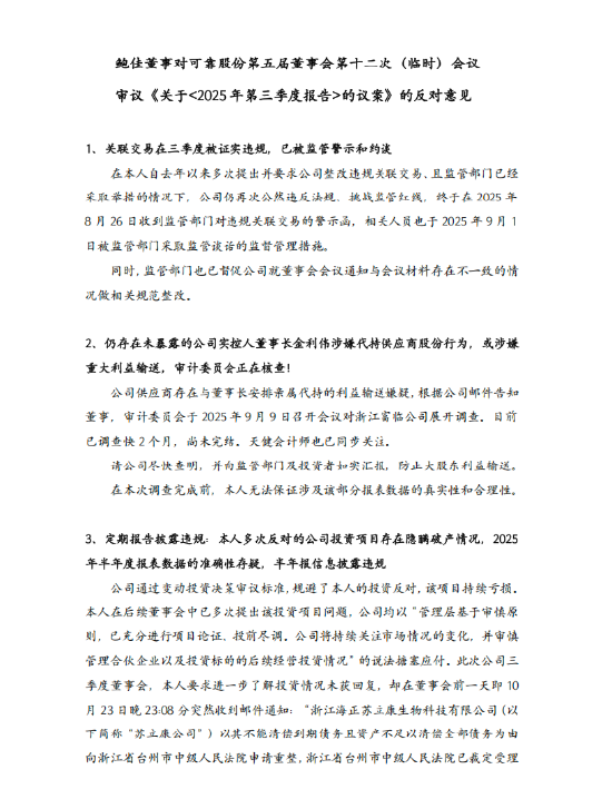 但在可靠股份2025年10月24日召开的董事会会议上,可靠股份董事鲍佳与独立董事景乃权分别对《2025年第三季度报告》投出了反对票与弃权票。