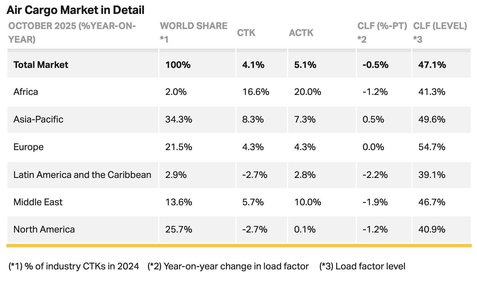 值得注意的是,亚太地区的航空货运正处于上行周期。国际航空运输协会(IATA)数据显示,10月亚太地区运输需求(CTK)增长8.3%,表现强劲。在需求改善背景下,国际市场整体载运率(CLF)下降,显示运力扩张更快。这对货量基础较稳的航司更为有利。