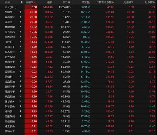 10只电子股涨停,、、“20cm”涨停,、、、、、等涨停。