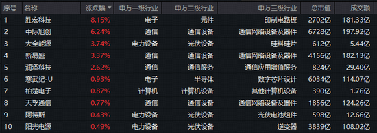 成份股方面,CPO概念股领涨超8%;光模块三巨头、、分别上涨6.24%、3.37%和0.77%;AI芯片龙头涨近1%股价再度超越,位居A股第一;光伏龙头涨超3%,、飘红。