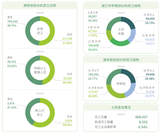 人员方面,2025半年度ESG报显示,截至6月末,工行集团共有员工408,437人,其中,男性员工占比48.15%,女性占比51.85%。今年上半年,工行新进员工数量为8332人,女性占比58.56%