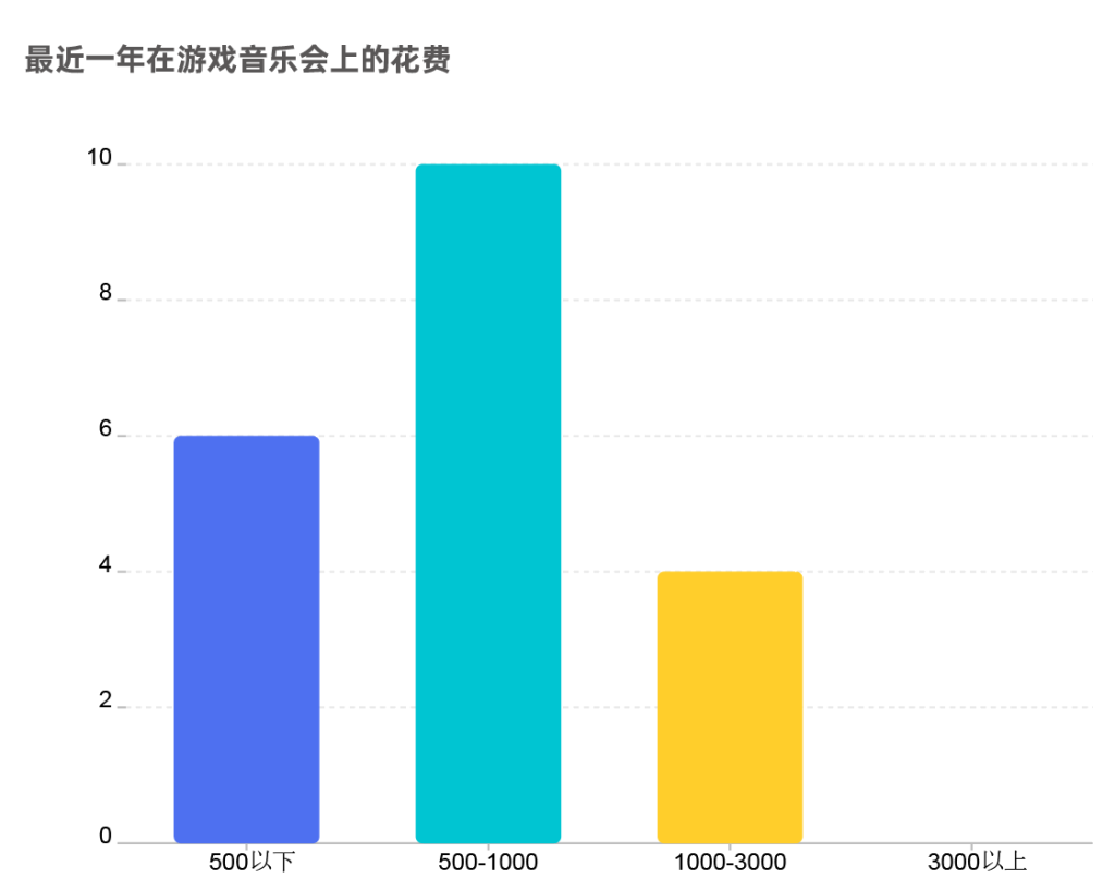 被访者中9名已工作消费者的月收入在8000元以上,9名大学生的月生活费在1000-6000元之间。10人(47.62%)在游戏音乐会上的年消费额在500-1000元。
