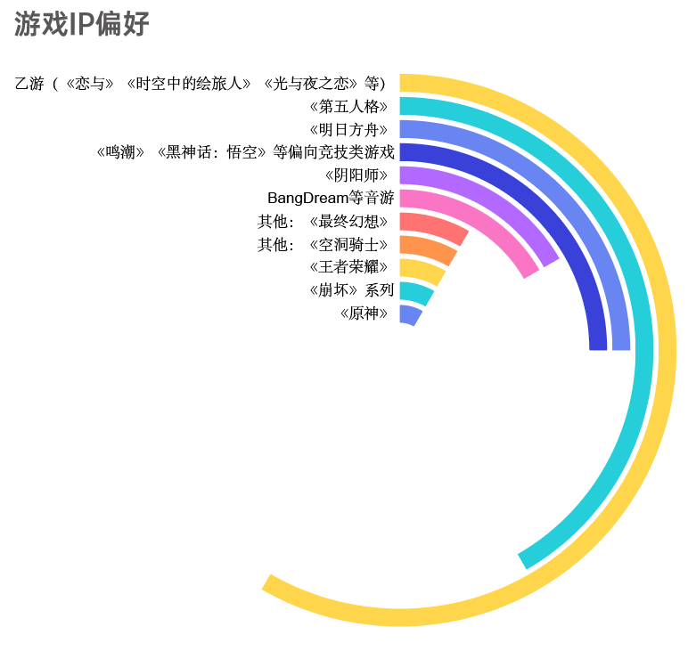 最受欢迎的游戏IP是《第五人格》和《明日方舟》,其中前者在12位中学生和大学生受访者中覆盖率达到41.67%(5人提及)。最受欢迎的游戏类别是乙游(由于乙游玩家经常数个游戏“通吃”,统计中被合在了一起),总计7人,占1/3,其次是竞技类(6人,28.57%)和策略类(5人,23.80%)。