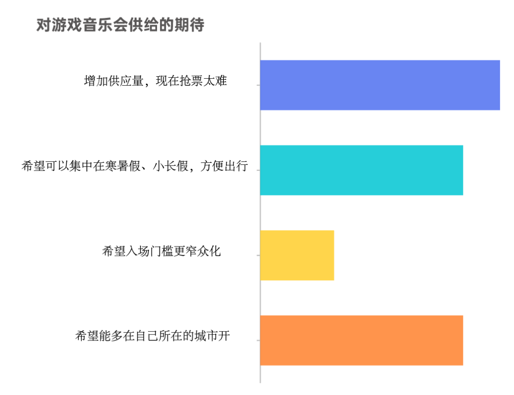 目前各类游戏的IP,无论乙游还是竞技类、策略类,线下音乐会最大的问题都是供给不足。10位受访者(47.62%)提到现在线下音乐会供给量严重不足。“不是愿不愿意听的问题,而是抢不抢得到票的问题。”