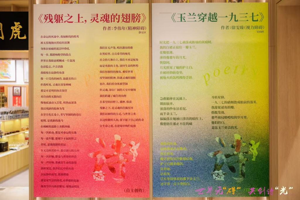 闭幕式当天,在上海书城6楼,同步开启了名为“诗之光”的残疾人诗歌作品展览,展出了在“诗歌创作”征集活动中残疾人创作的优秀获奖作品,让他们的才华与心声被更广泛地“看见”和“听见”。残疾人们用诗歌书写自己对生命的感悟。诗人李伟年写到,“轮椅,是我新的战马/在崎岖的道路上奔腾冲撞/每一次转动,都是对命运的宣战/每一道车辙,都刻下不屈的誓言。”诗人何惠莉写到,“从前堵在胸口的哽咽/如今跟着合唱淌成了歌/那些蜷在关节里的疼/被舞步踩成了碎光/拐杖敲在地板上的响/都带着笑的弧度。”