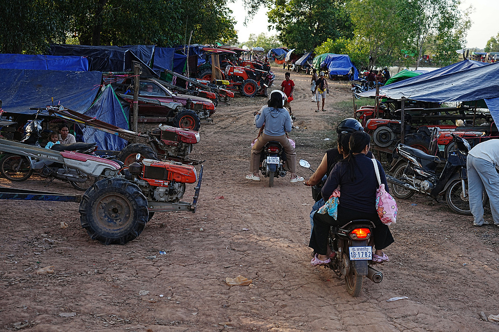 当地时间2025年12月9日,柬埔寨暹粒省,当地居民骑摩托车逃离柬埔寨与泰国边境的家园。视觉中国 图