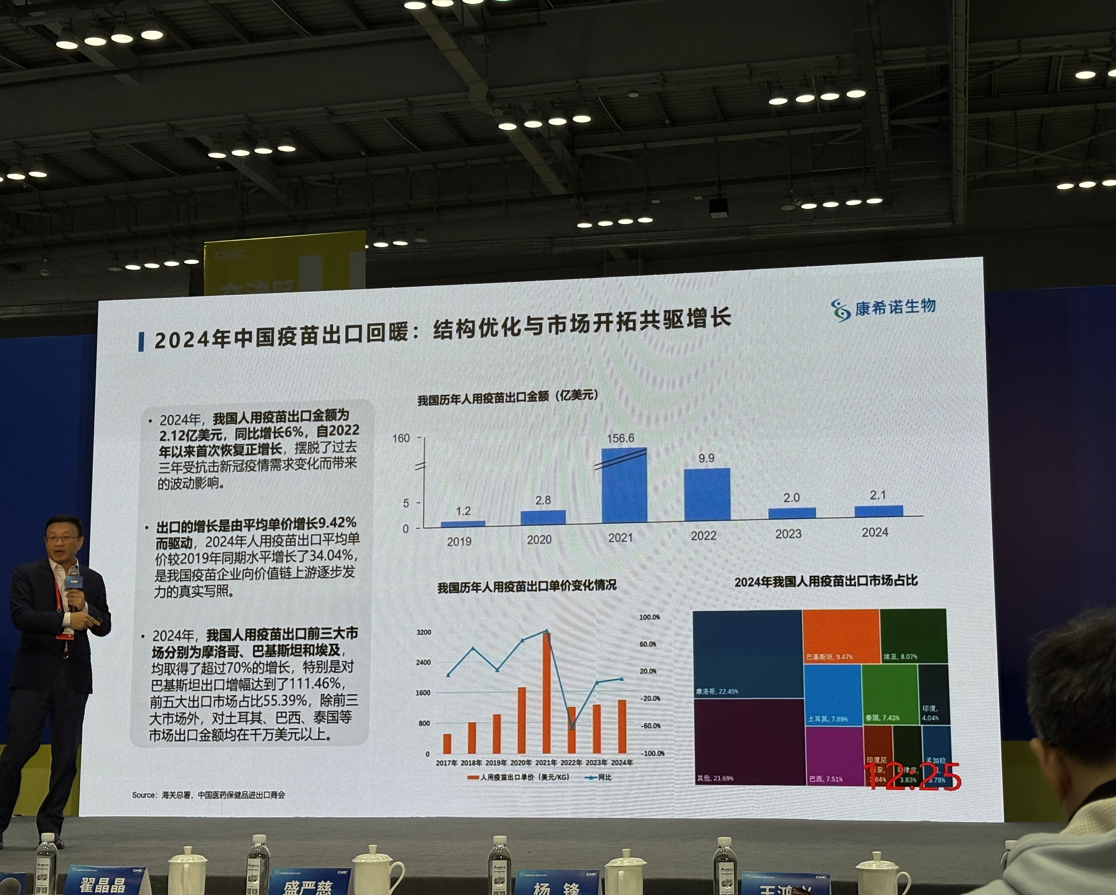 此外,在16届泰州医药博览会现场,康希诺生物副总裁、国际业务负责人王鸿义向界面新闻表示,中国疫苗出口处于爆发前夜,目前还没有在放量阶段,从趋势来看,未来三年,中国人用疫苗出口金额或将在2024年基础上再显著增长。