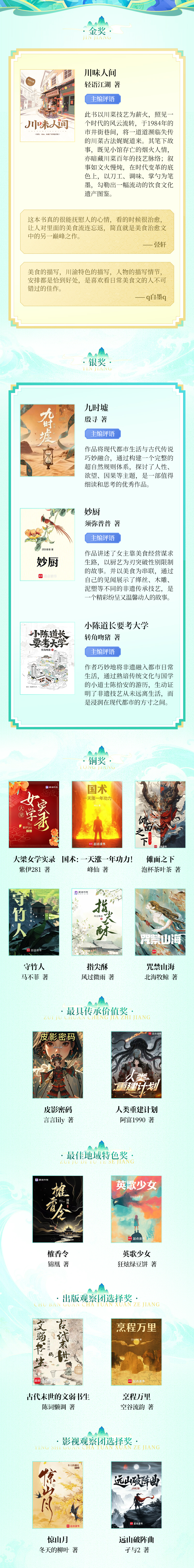 本届大赛共征集作品7万余部,内容涵盖传统技艺、传统体育、民俗、曲艺等领域。其中,95后作家“轻语江湖”创作的《川味人间》脱颖而出斩获金奖,《妙厨》《九时墟》《小陈道长要考大学》荣获银奖,《国术:一天涨一年功力!》《守竹人》《傩面之下》《咒禁山海》《指尖酥》《大梁女学实录》获铜奖。